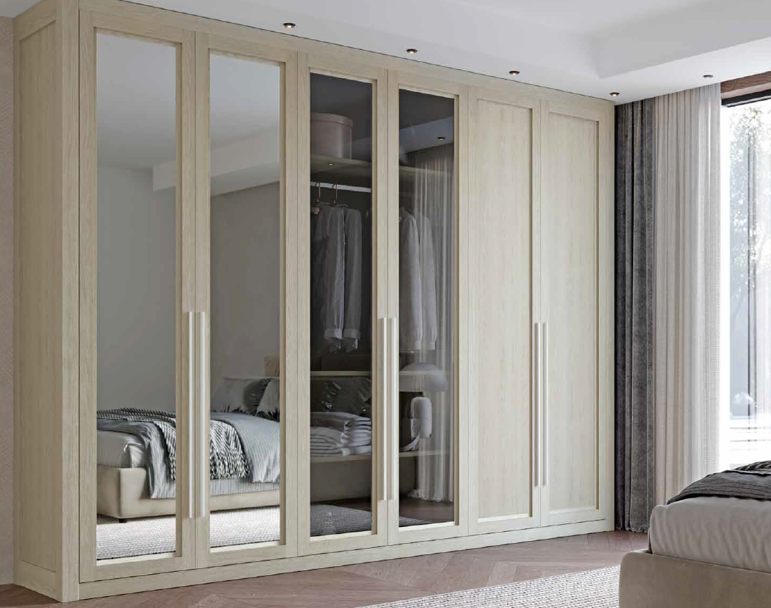 Puerta abatible con diseño Hong-Kong que combina panel Taiga, espejo y cristal transparente. Incluye tirador Line blanco, creando un frente ligero y elegante. Es una solución muy recomendada para armarios de dormitorio en los que se desea integrar un espejo sin recargar el diseño.