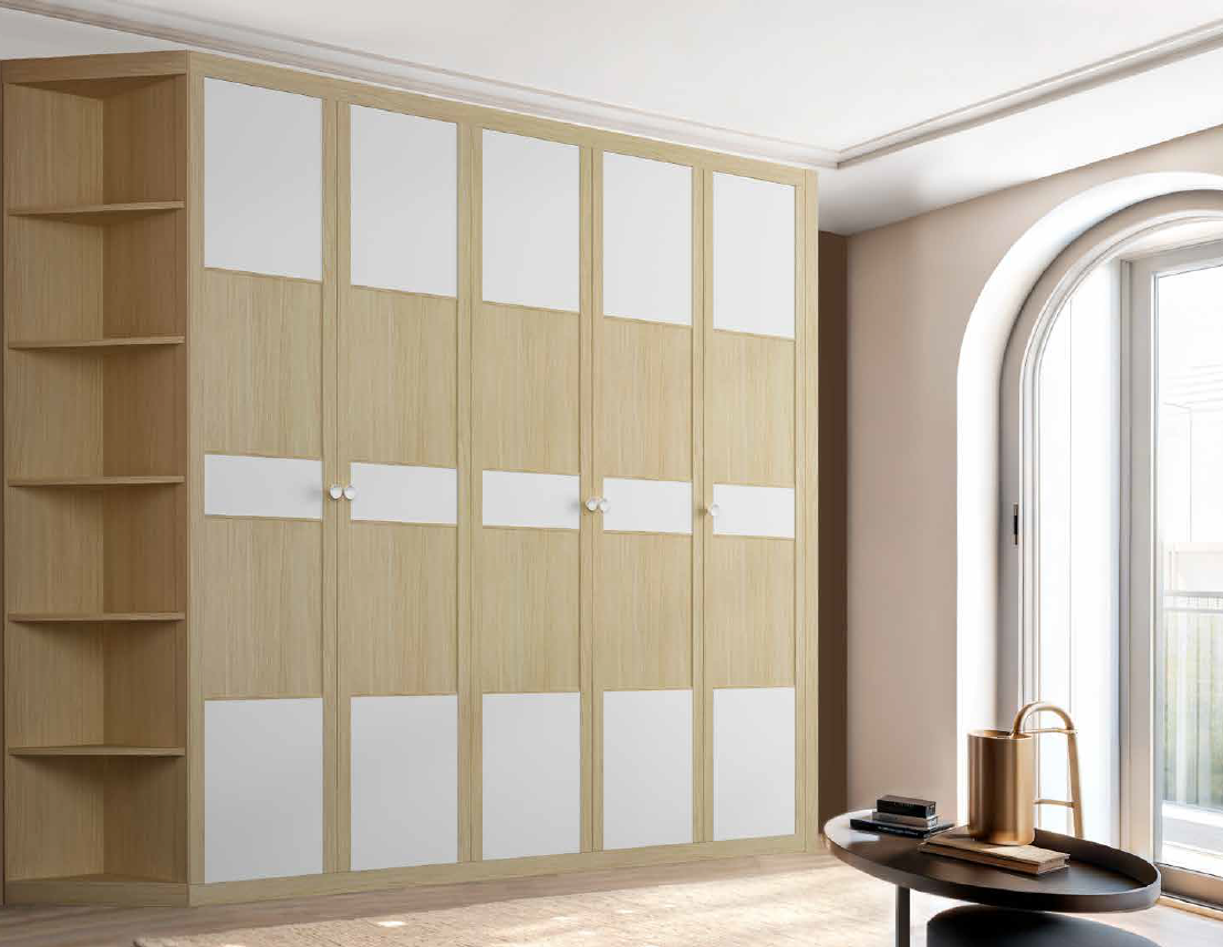 Puerta abatible de inspiración japonesa con cuarterones finos, combinando paneles en melamina blanca y olmo. Incorpora tirador Conic blanco, logrando una imagen equilibrada entre calidez y claridad. Ideal para armarios de dormitorio de estilo nórdico o contemporáneo.
