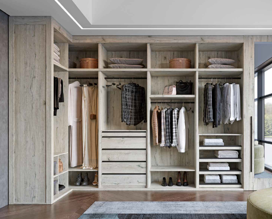 Vestidor abierto en melamina acacia con herraje negro y tiradores Line negros. El contraste entre la madera cálida y el negro aporta un estilo moderno y acogedor, perfecto para dormitorios actuales y proyectos de interiorismo contemporáneo.
