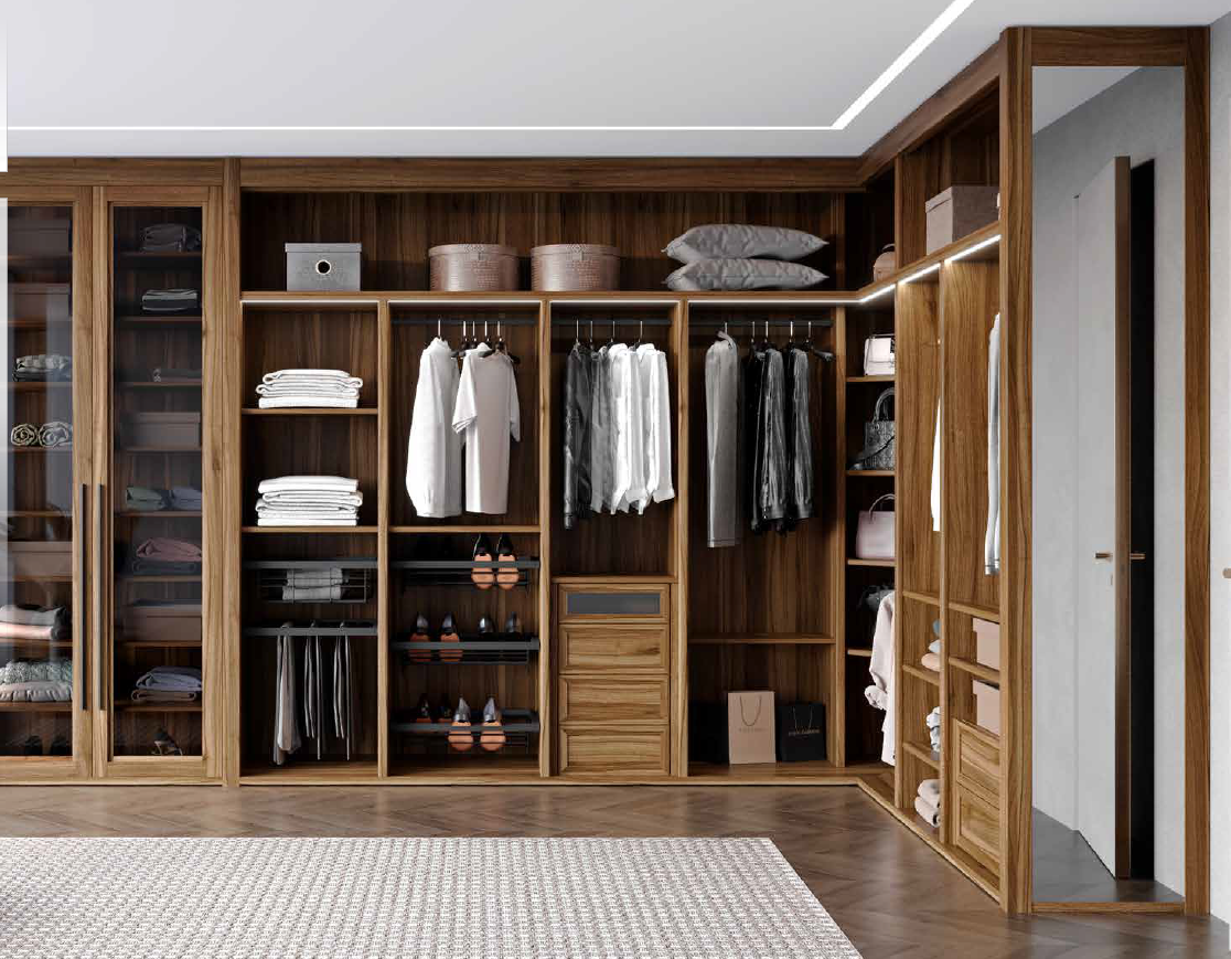 Vestidor abierto en melamina nogal con herrajes en color negro y tiradores Line negros en los módulos. Ofrece un aspecto tipo boutique, muy cálido y contemporáneo, ideal para espacios donde la ropa y los complementos quedan a la vista.